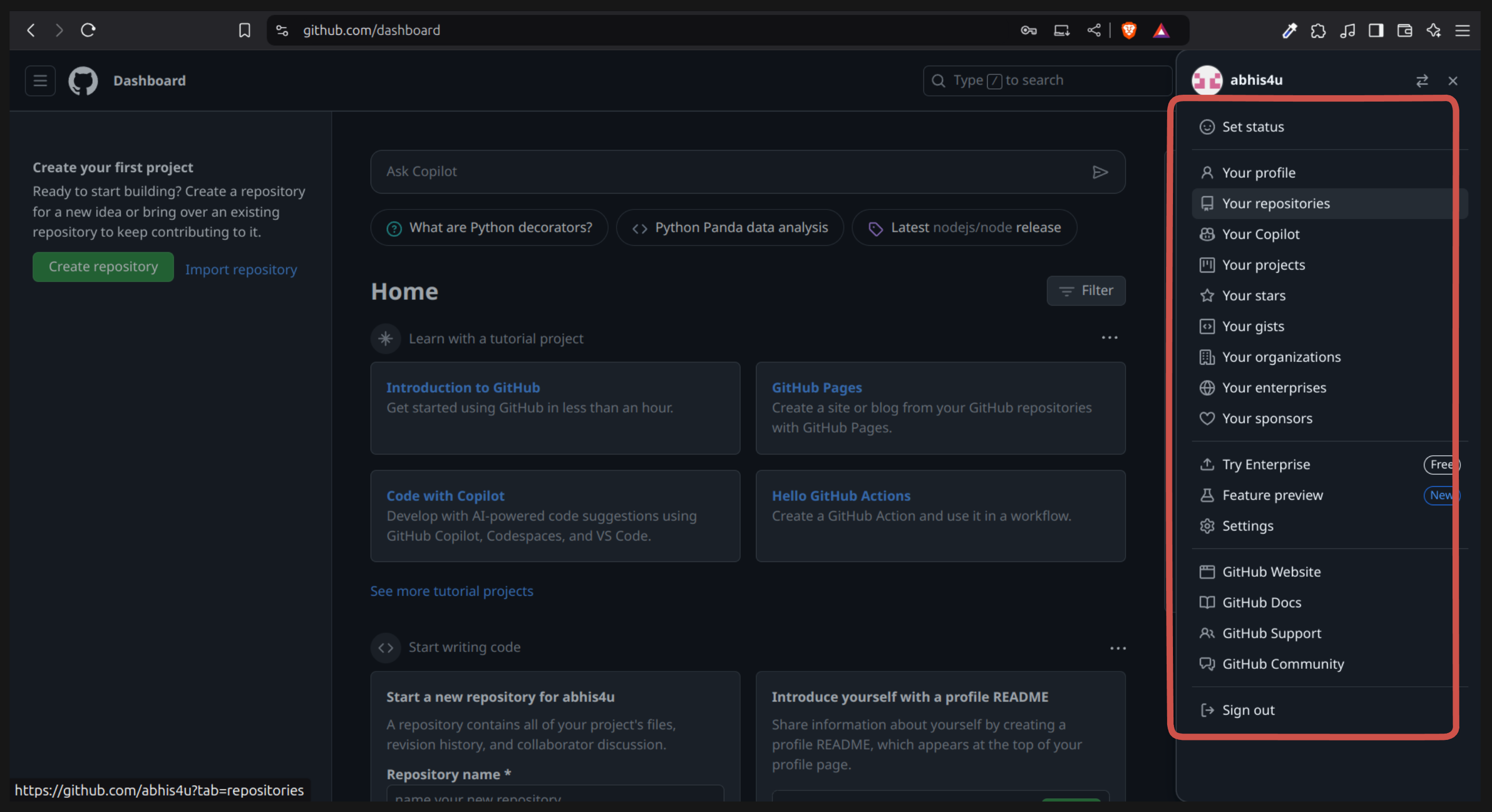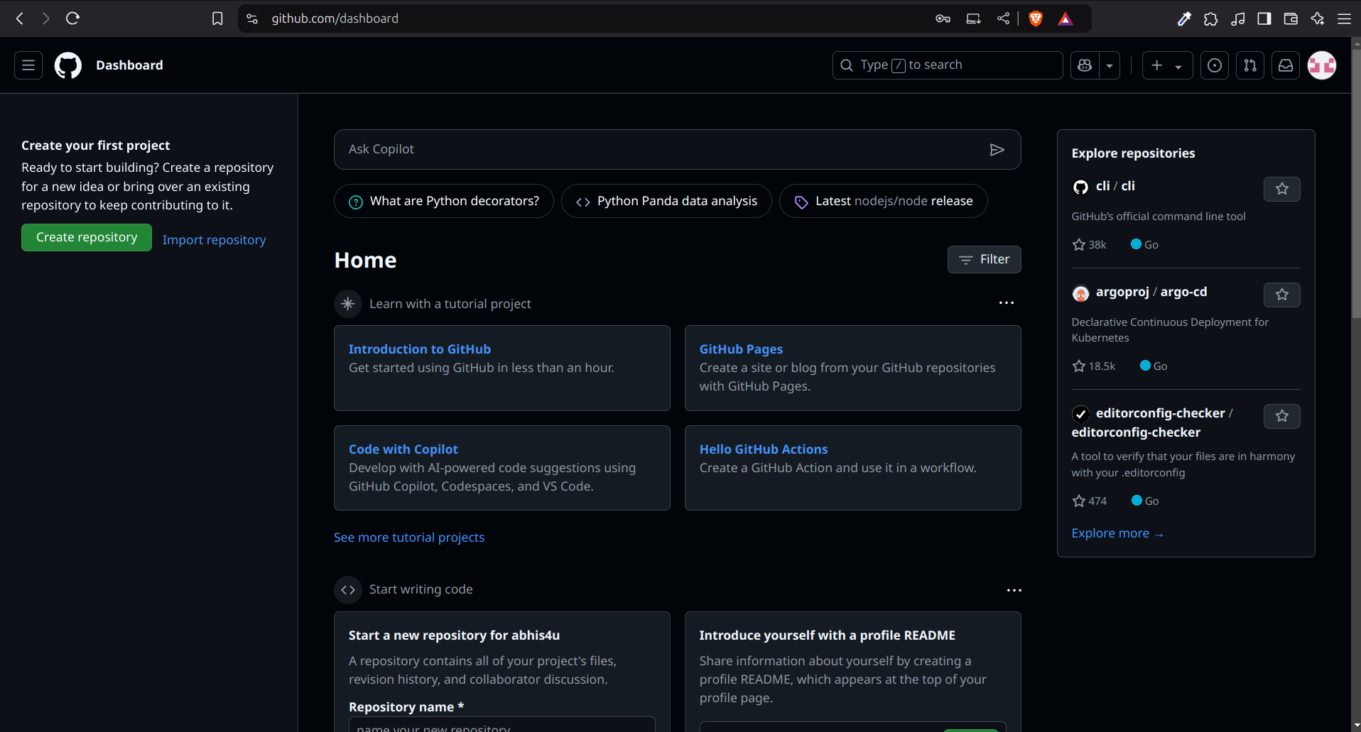 Youโll now see your Dashboard, where you can create repositories, explore other projects, and manage your profile.